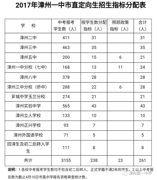 (3)面向市直招收正取生511人,其中统招生250人,定向生261人(请于7月13-15日上漳州教育局官网www.fjzzjy.gov.cn/网上填报志愿),定向生具体分配指标见下表: