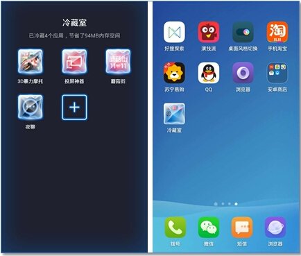 所谓“冷藏室”的功能,实际上是指用户可以自主选择将一些不常用的APP放入“冷藏室”冷冻起来,这些App就不会再占用内存和CPU,直到需要用的时候再“解冻”出来即可。